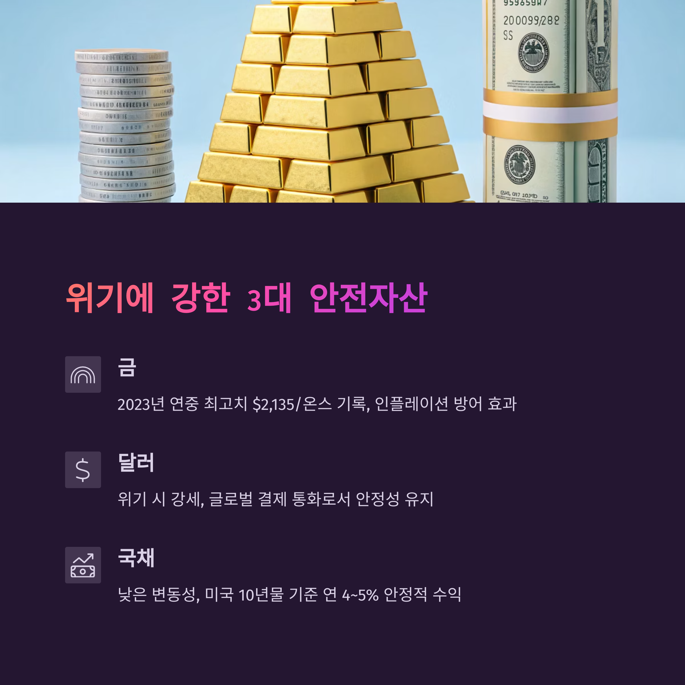 | 안전자산이란? | 경제 위기 시 가격이 비교적 안정된 자산을 의미합니다. |