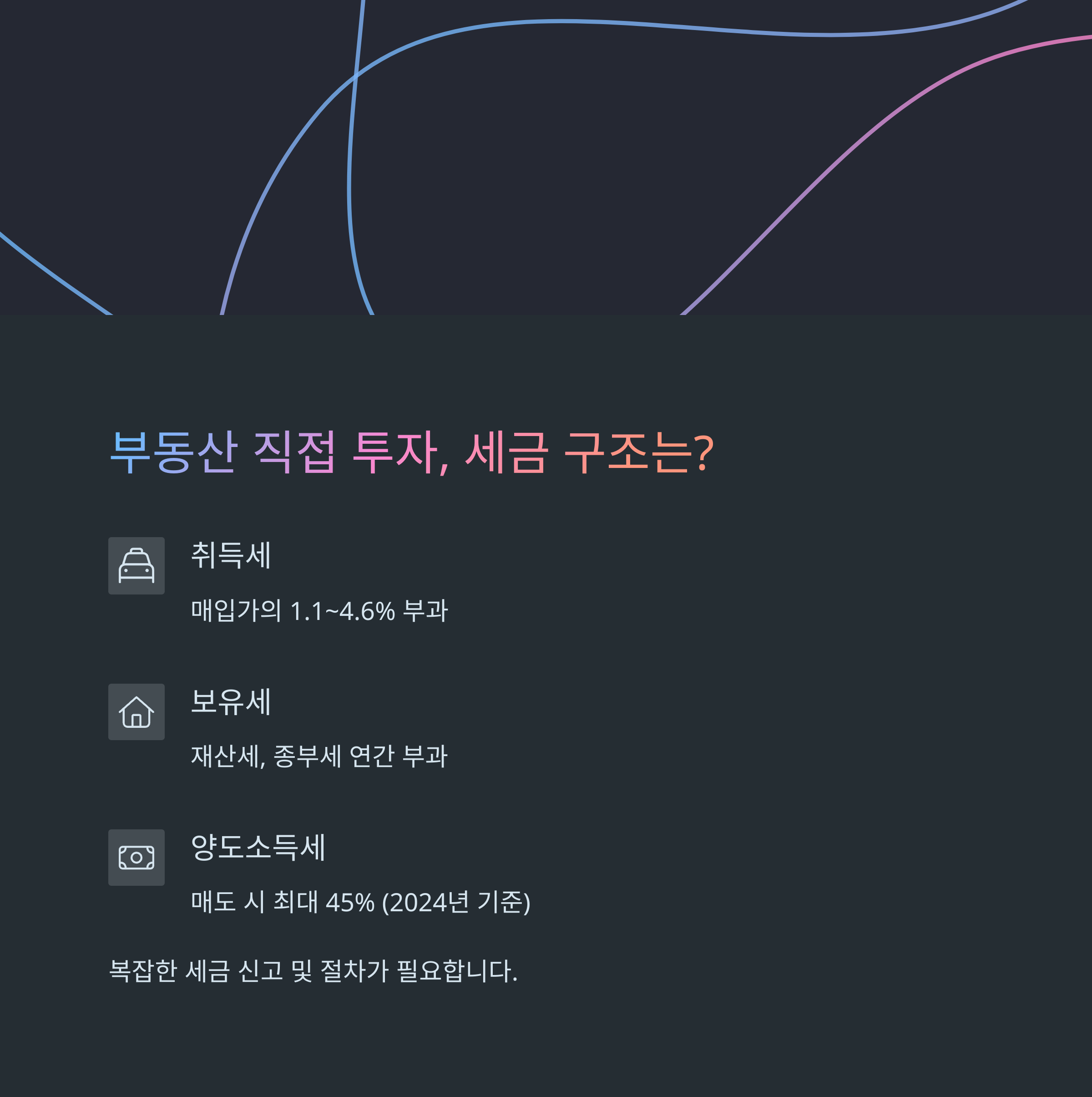 | 부동산 세금 | 취득세, 보유세, 양도세 등 복합 과세 구조 |