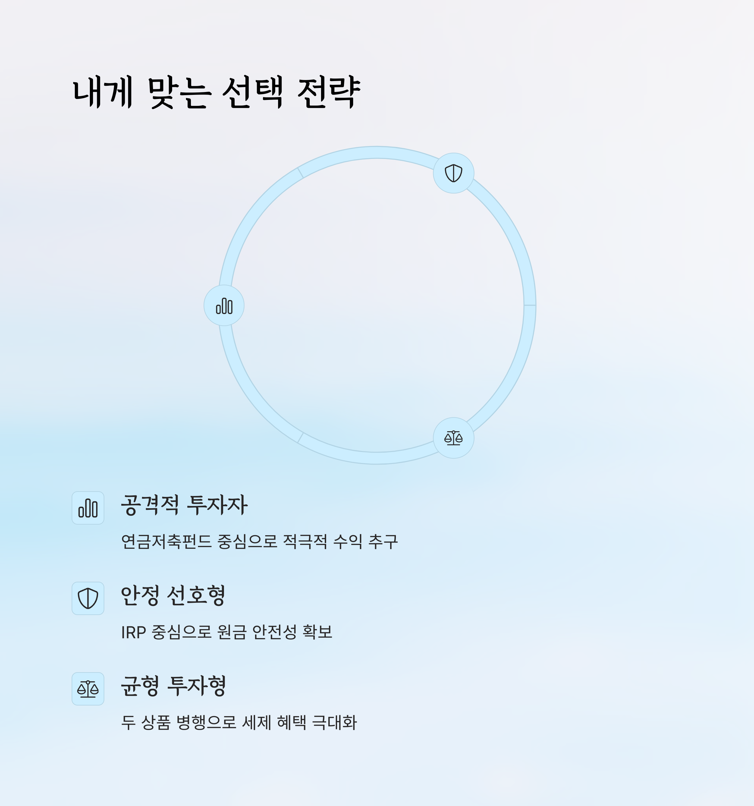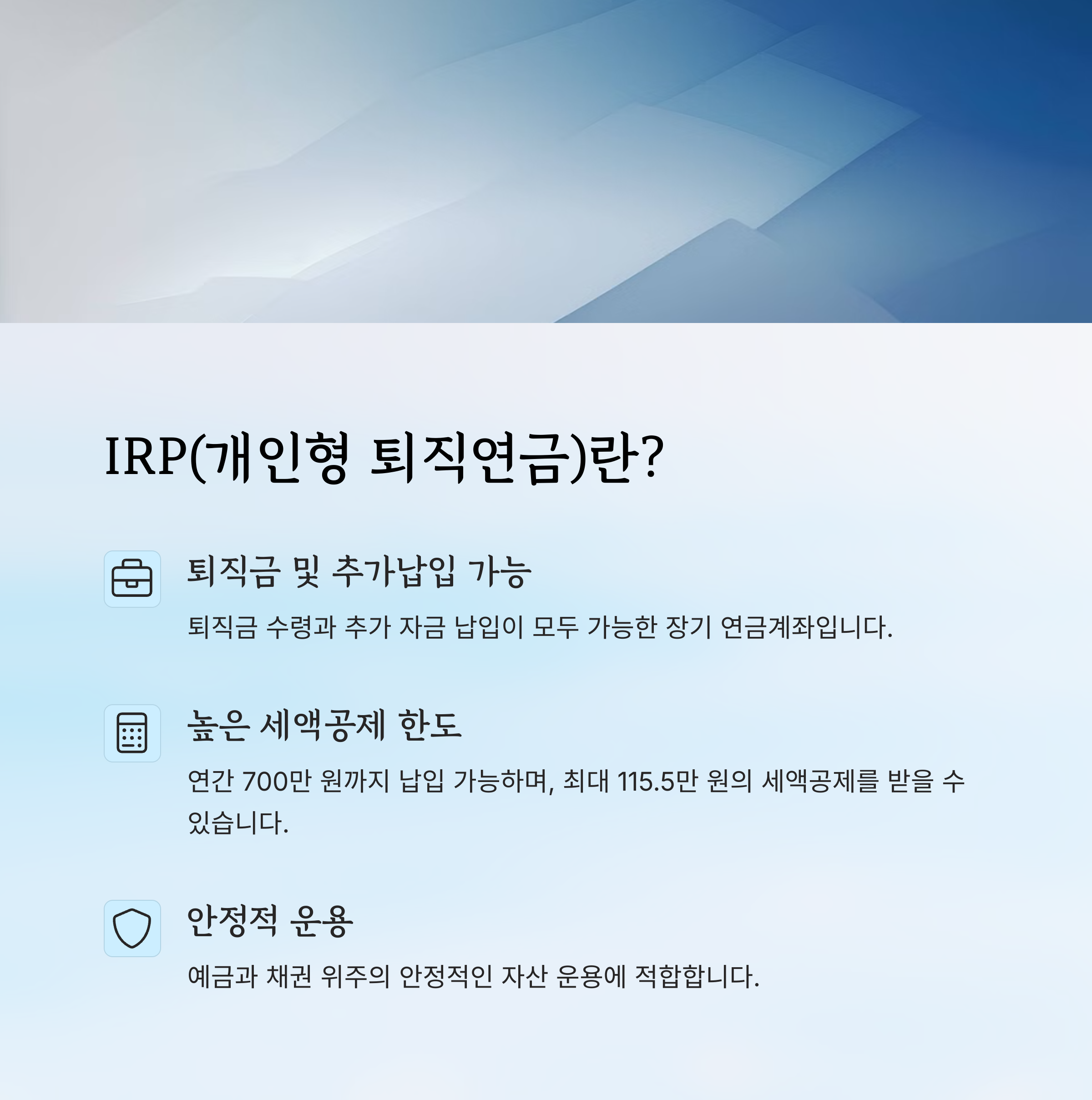 | IRP | 퇴직금 및 추가 납입을 통해 운용되는 장기투자 연금계좌입니다. |