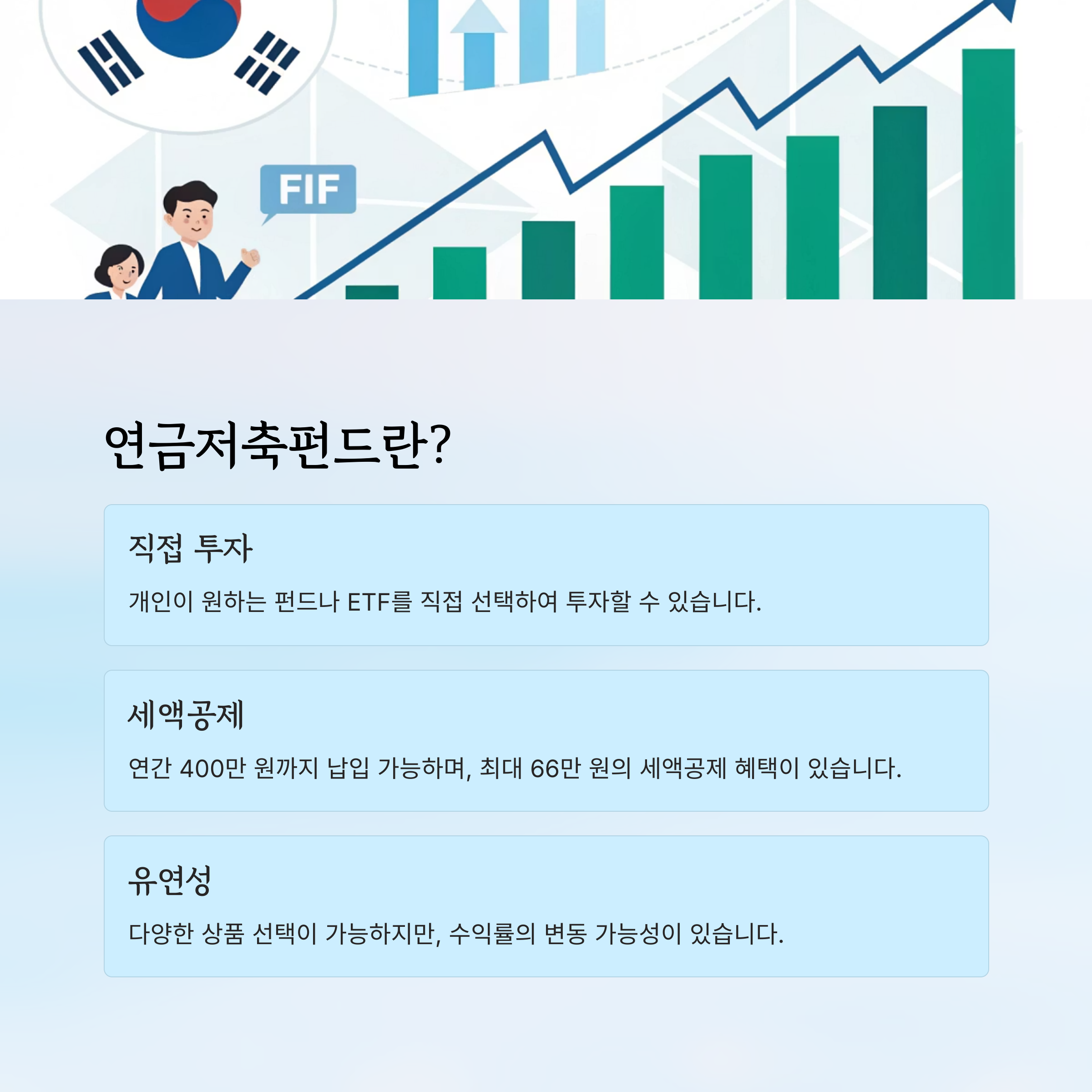 | 연금저축펀드 | 개인이 직접 운용하는 세액공제형 투자 연금상품입니다. |