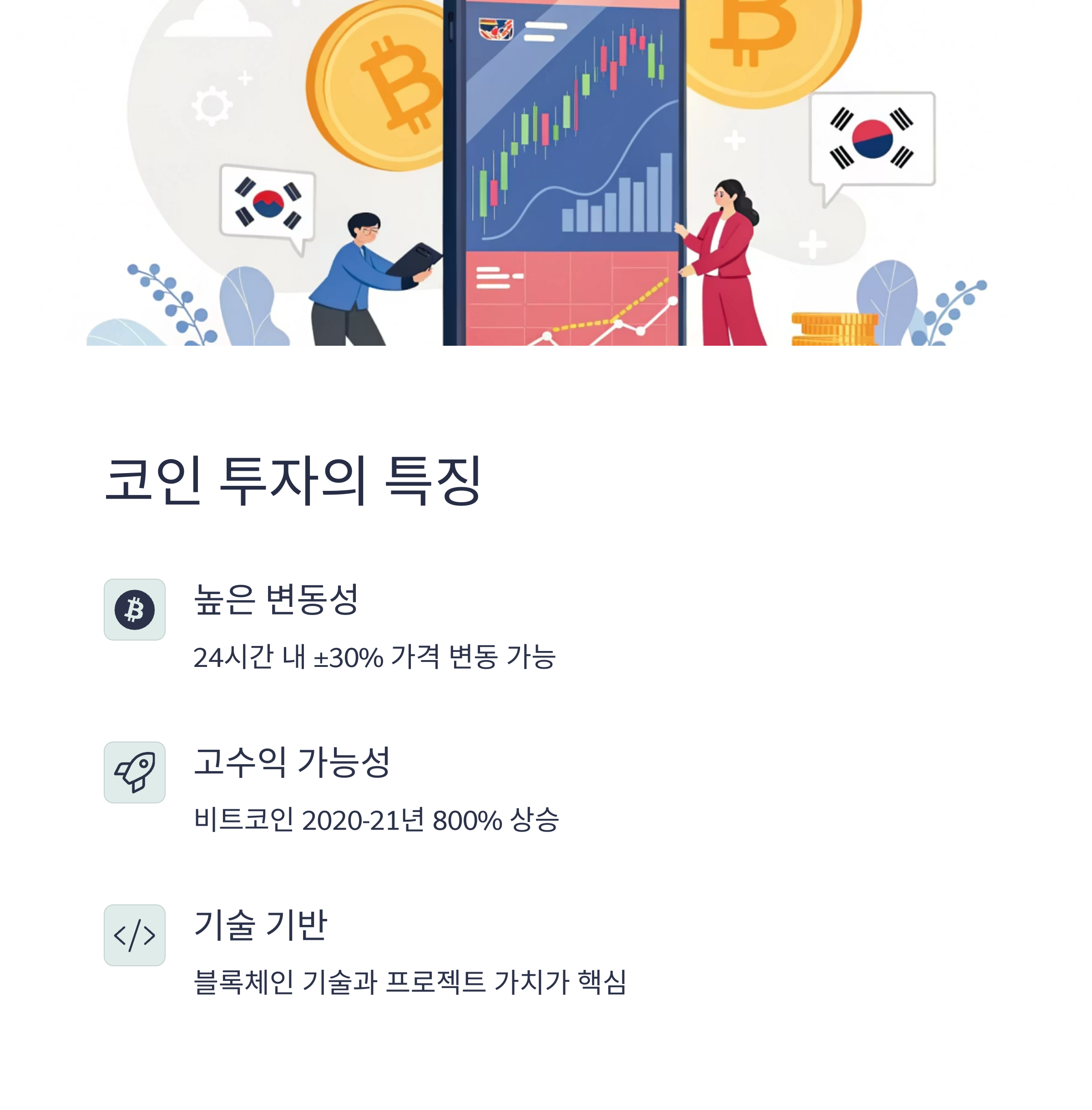 | 코인 투자 | 높은 변동성과 빠른 수익 실현이 가능한 고위험 투자 |