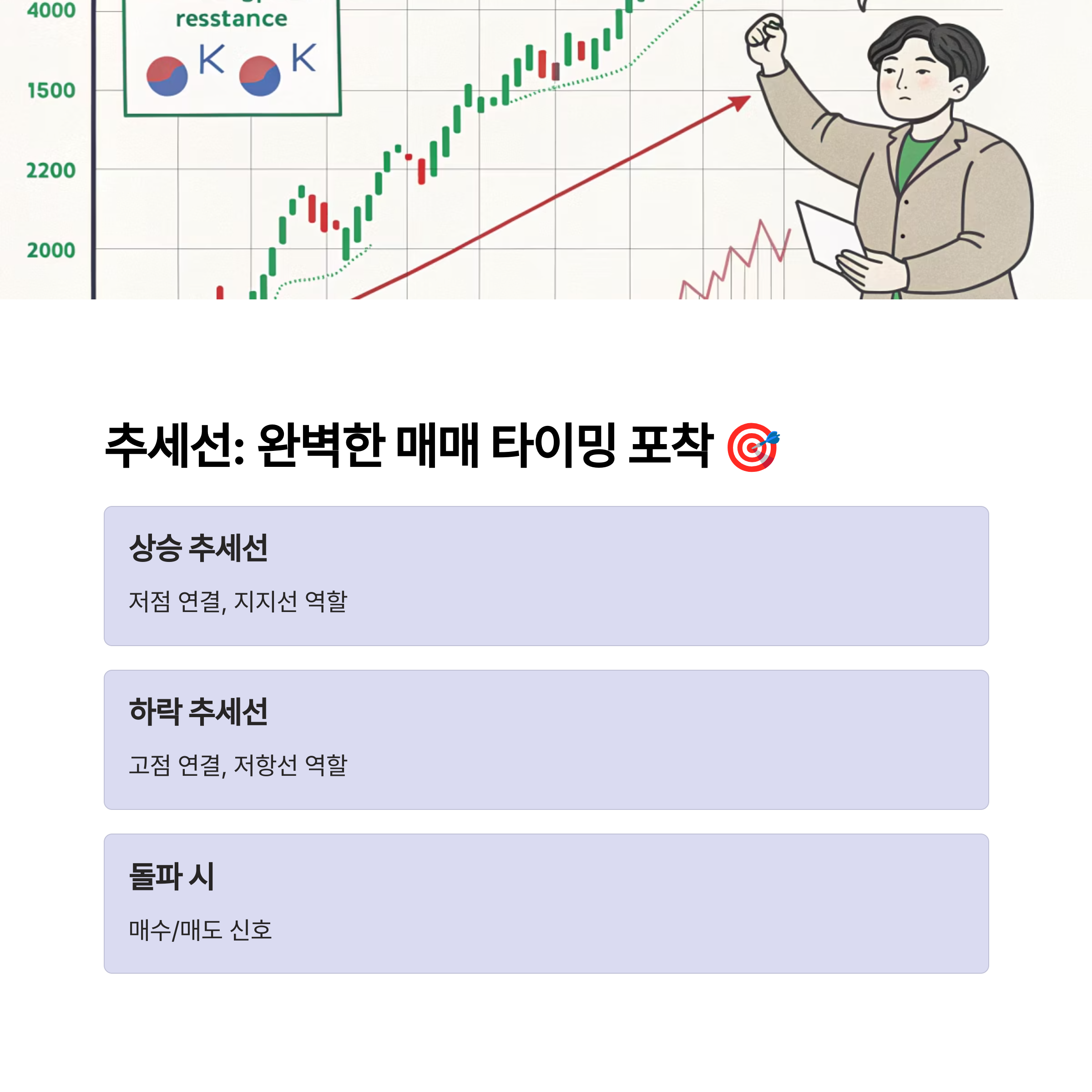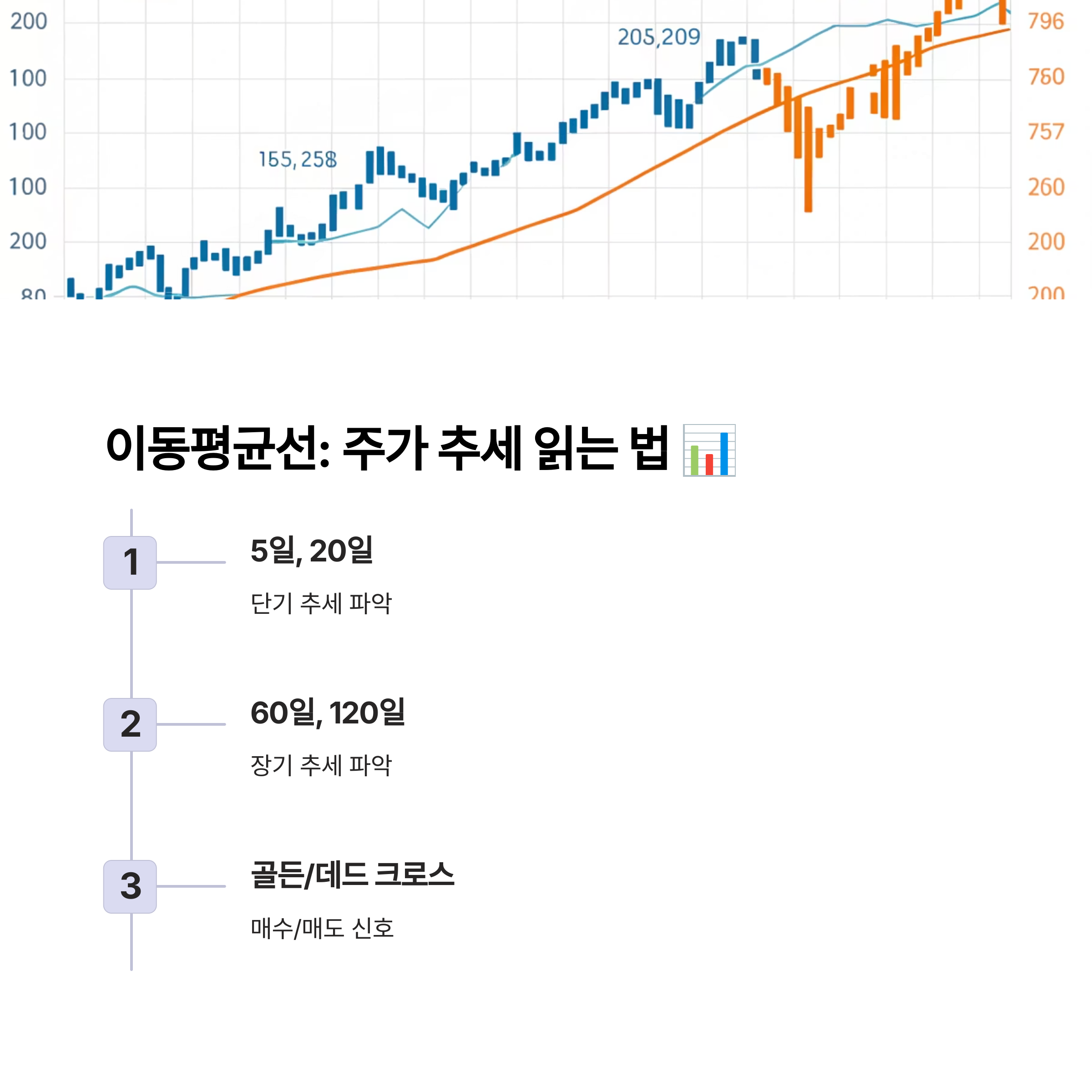 | 봉의 색과 위치로 매수·매도 심리 파악 | 골든크로스, 데드크로스로 방향성 분석 | 추세 추종 매매의 핵심 도구 |