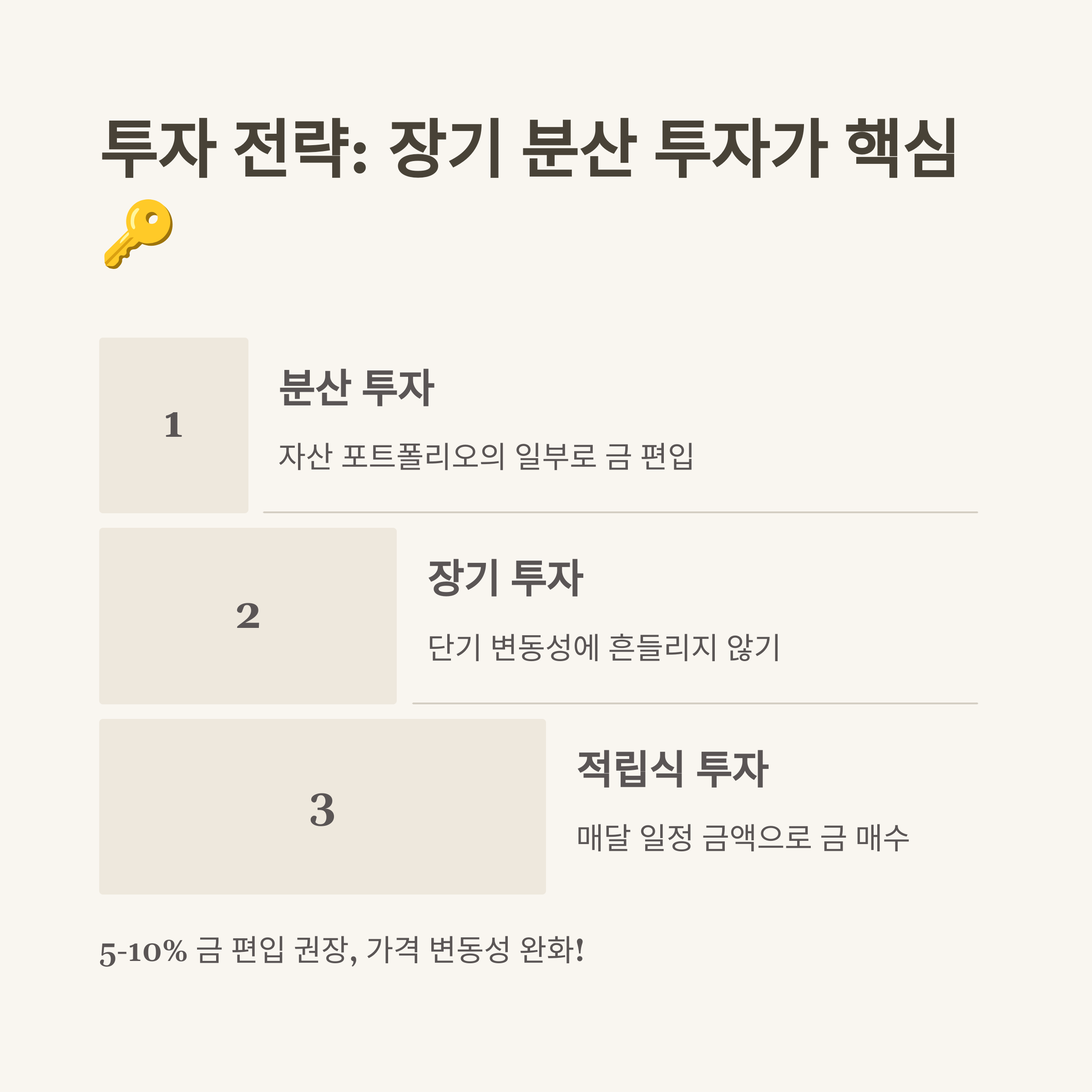 금에 투자할 때는 장기적인 시각을 유지하는 것이 중요합니다. 단기적인 시세 변동에 휘둘리기보다는, 자산 포트폴리오의 일부로써 안정성과 가치 보존에 주력해야 합니다. 또한 금 투자는 환율, 금리, 글로벌 정치적 이슈 등의 영향을 받을 수 있기 때문에 시장 흐름을 지속적으로 관찰하고 정보를 업데이트하는 것이 필수입니다.