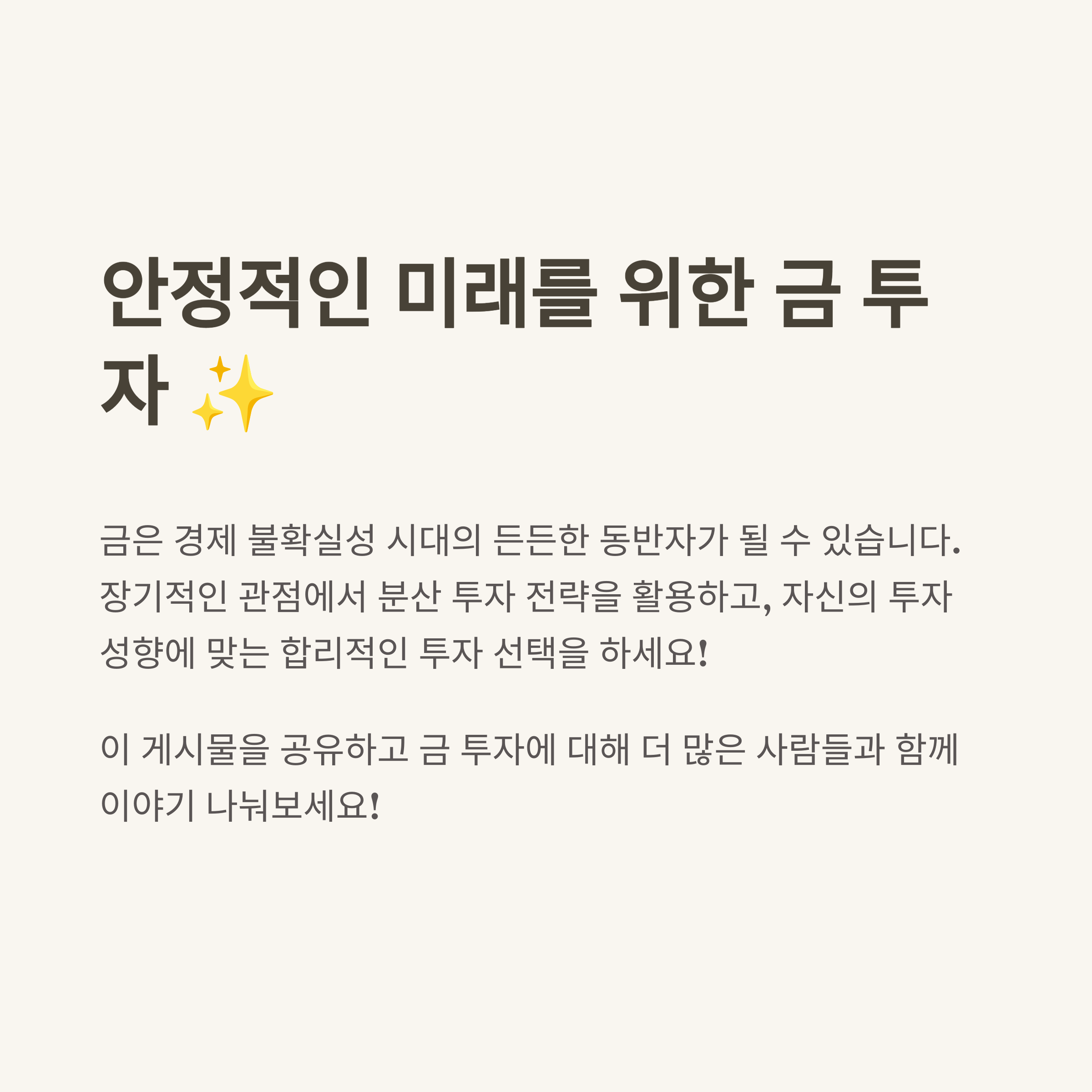 지금처럼 불확실성이 가득한 시대에는 금처럼 안정적이고 가치가 유지되는 자산이 더욱 주목받습니다. 금 투자는 단기적인 수익보다는 장기적 안정성에 중심을 둔 전략으로 접근해야 하며, 다양한 투자 수단을 통해 분산 효과를 극대화할 수 있습니다. 본인의 재무 상황과 리스크 감수 성향을 고려하여 적절한 방식으로 금 투자를 시작해 보시기 바랍니다. 때로는 가장 오래된 방식이 가장 안전한 해답일 수 있습니다.