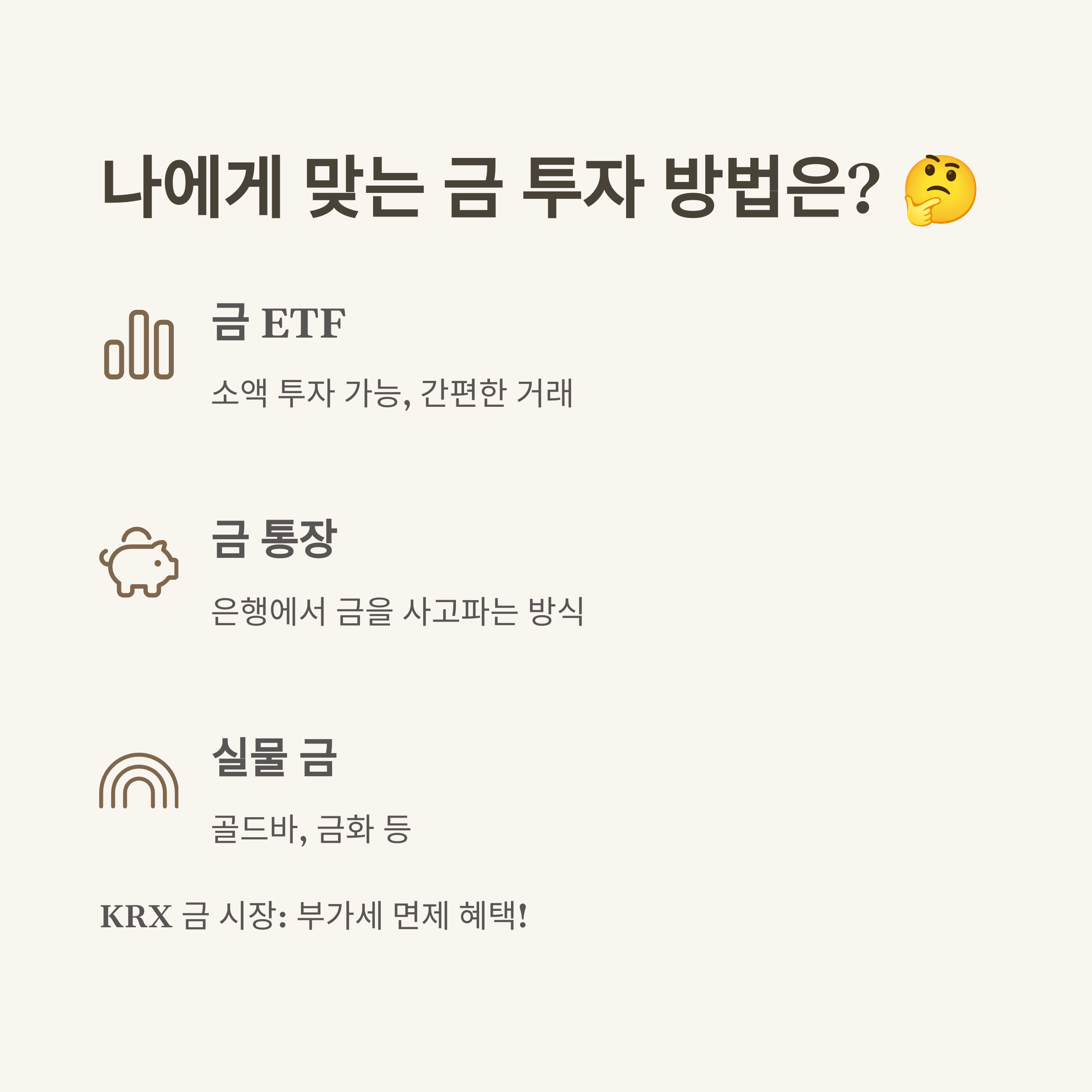 | 금 ETF, 통장, 실물, 펀드 등 다양한 형태 존재 | 세계 경제 불안이 심화될수록 수요 증가 | 변동성, 세금, 보관 방식 등 고려 필수 |