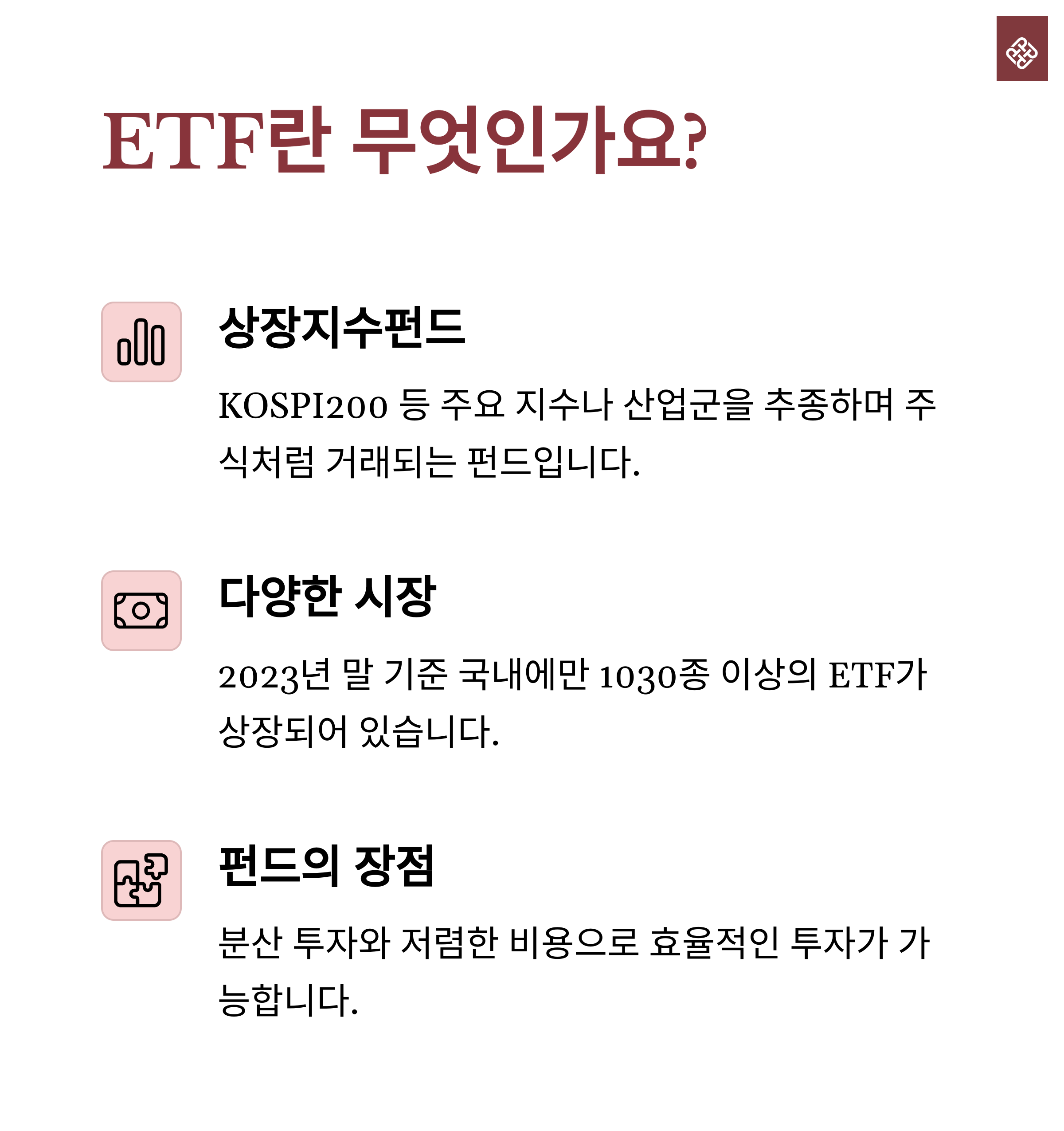 | 지수 추종형 펀드, 주식처럼 실시간 거래 | 지수형, 섹터형, 원자재, 테마형 등 다양 | 분산 투자, 장기 보유, 상품 이해 필수 |