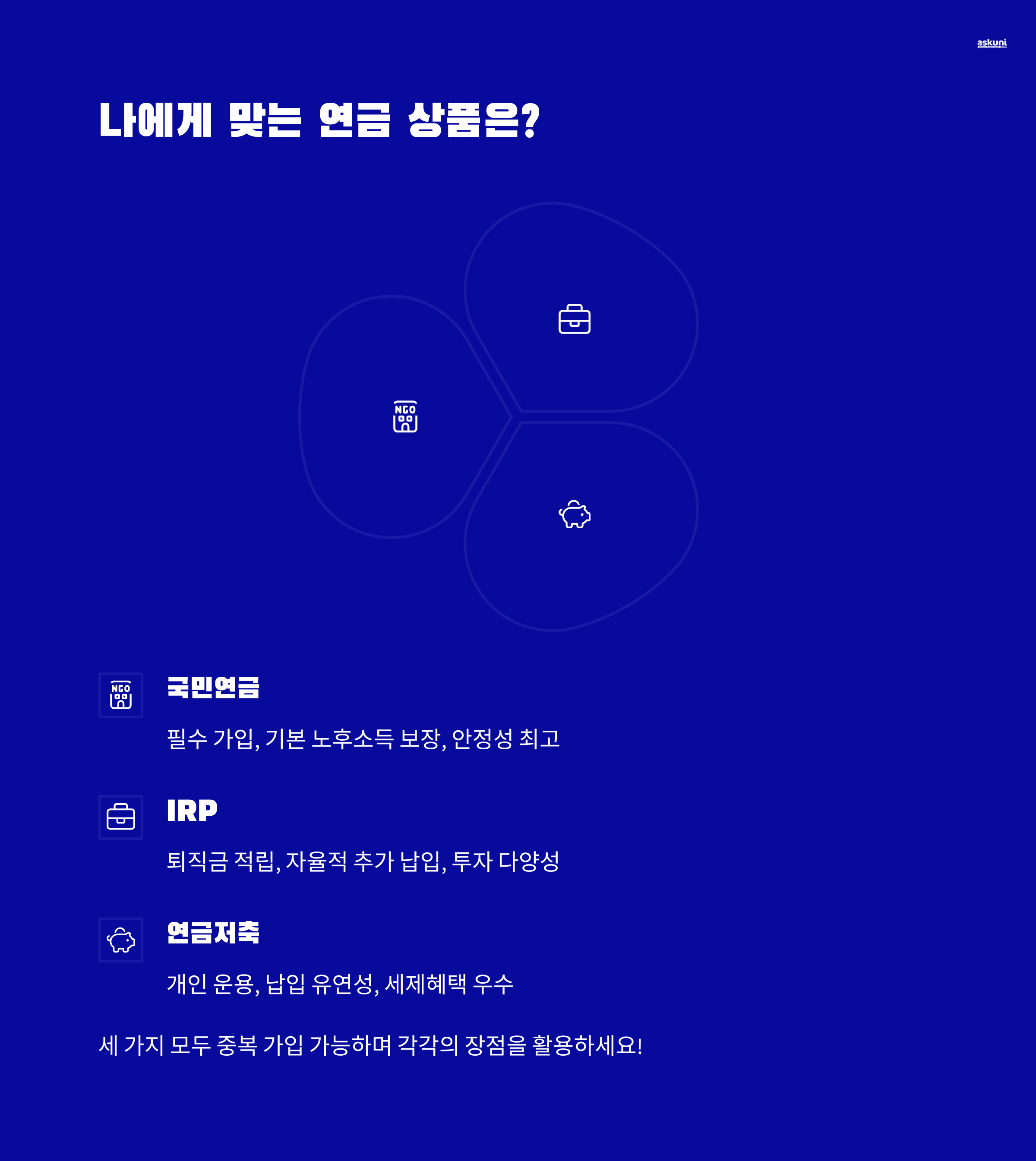 | 국가가 운영하는 기본 연금 제도 | 퇴직금 기반의 개인형 연금 계좌 | 세액공제 가능한 개인 연금 상품 |
