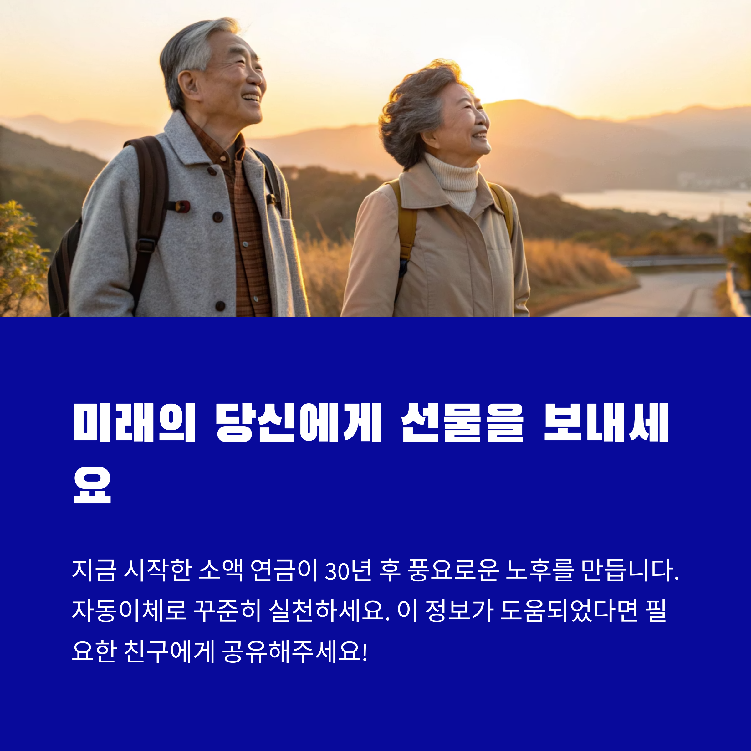 30대는 연금 준비의 골든타임입니다. 시간이 줄 수 있는 복리 효과, 세액공제 혜택, 투자 경험을 바탕으로 한 장기 자산 운용 등 모든 면에서 이점을 가지고 있는 시기입니다. 단기적 소비보다 미래를 위한 투자라는 마인드를 가진다면 소액이라도 꾸준한 연금 납입은 큰 변화를 만들어냅니다. 오늘의 선택이 10년, 20년 후의 삶을 완전히 달라지게 할 수 있다는 점에서 지금이 바로 시작할 때입니다. 나의 노후를 남이 아닌 스스로 준비한다는 자립적인 자세가 당신의 미래를 더욱 든든하게 만들어줄 것입니다.