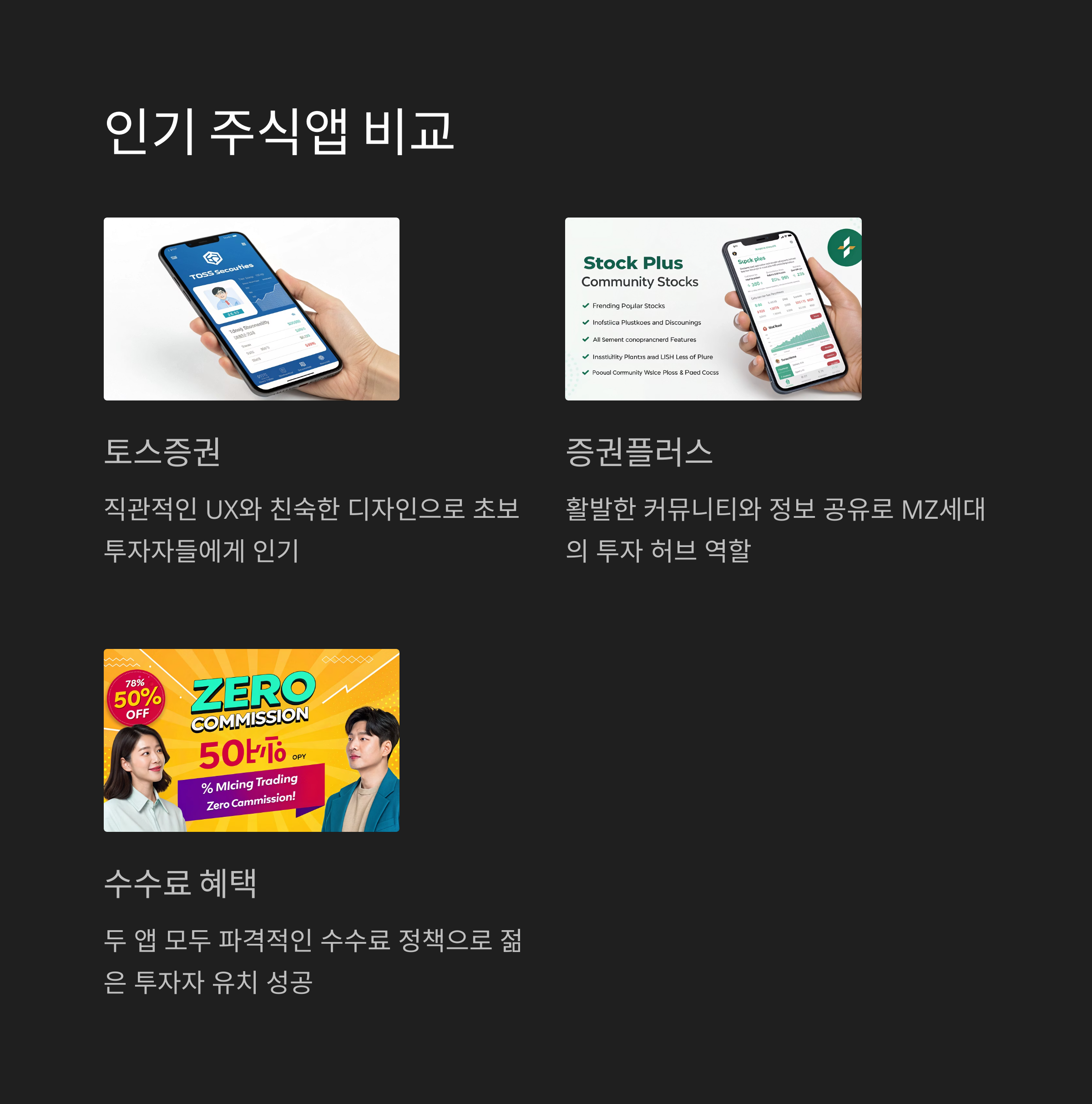 | 증권플러스, 토스증권, 신한알파 등 | 속도와 감성 중심, 커뮤니티 중시 | 수수료, UI, 실시간 정보, 보안 |